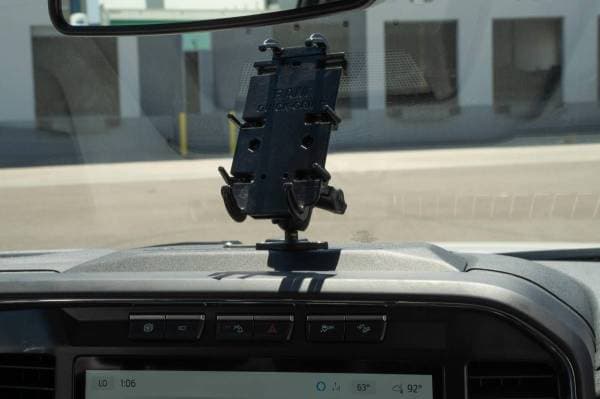 Our Digital Device Dash Mount is a convenient solution for holding your handheld devices in your truck's cab. It's compatible with Ram Mounts and similar holders, allowing easy access to your smartphone, action cameras, GPS, radio mic, and tablet. Plus, it includes dual 12V USB charging ports to power your devices without interfering with the factory in-dash speaker. Made from sturdy 1/8-inch American steel and finished in black powder coat, this mount is proudly Made in the USA. Please Note: Drilling and wiring is required for installation.