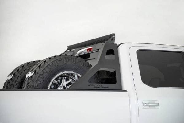 The Stealth Fighter is a lightweight chase rack that gives your Ford Super Duty a unique style without adding bulk. The fully bolt-on design creates an easy installation with no drilling required. Mounting slots on the upper piece allow you to add extra lighting with a 50" light bar. Third brake light function is fully retained and no bed space is sacrificed. The Stealth Fighter is finished in a hammer black powder coat and made in America.