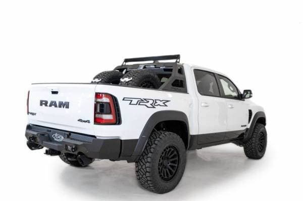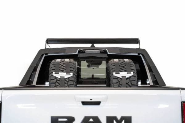 The Stealth Fighter Chase Rack brings a sleek plate steel design to the bed of your Ram TRX. The curve of the rack follows the lines of the cab perfectly and gives the option to mount a forward facing 50" light bar. A cutout in the cross member also retains full functionality of the factory third brake light. Installation is easy as this uses a clamp mount design that does not require any cutting or drilling into your Ram?s truck bed. The rack comes in hammer black powder coat and is made in America.