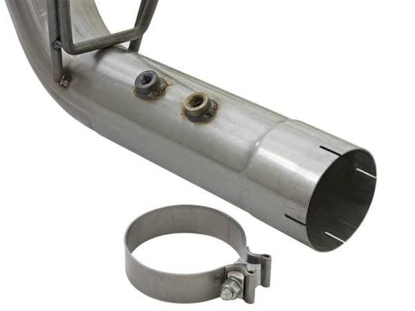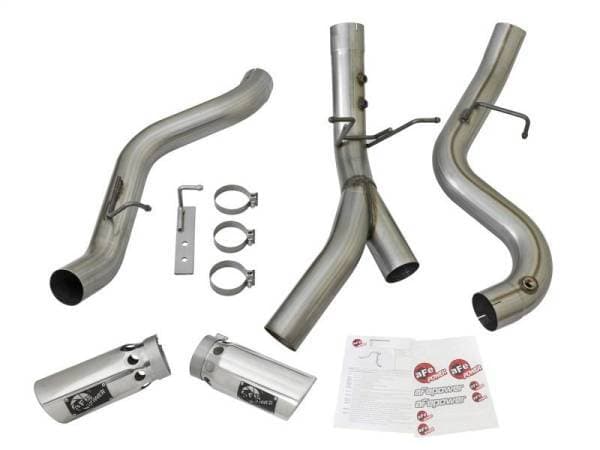 Interested in a new exhaust system for your L5P Duramax? Check out the Large Bore-HD dual DPF-Back exhaust system by aFe. This system is constructed from 4" mandrel-bent 409 stainless steel tubing and uses high quality band clamps and OE-style bayonet hangers. This unit uses all factory mounting locations and comes with a bolt-on bracket that supports the driver side tailpipe. This provides for a quick, hassle-free installation with no modification necessary. Also included in this exhaust system are dual massive 6" high temp black powder-coated stainless steel tips with a laser-cut stainless steel aFe power badges. Large Bore-HD exhaust systems are the perfect combination of performance, fit and value. Single To Dual Exhaust Conversion: This exhaust is designed to convert the standard single exhaust into an aggressive dual exhaust. Fits With Spare Tire: This exhaust system fits perfectly without relocating the spare tire. OE Fit: OE-style bayonet hangers are used to maintain a stable pipe location during high vibration and high heat conditions. The bayonet tip holds the hanger bushing in place for an OE-style fit that does not change with time. Flow and Performance: This Large Bore-HD exhaust system is constructed from 4" mandrel-bent stainless steel tubing for maximum flow. Smooth transition bends allow for low turbulence, increasing horsepower, torque and lowering EGT's. Polished Tips: Finishing off the exhaust are dual high luster, polished 304 stainless steel slash-cut tips. This tip features a laser-cut stainless steel aFe power badge for an aggressive style