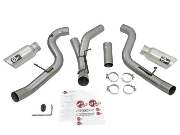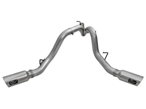 Interested in a new exhaust system for your LML Duramax? Check out the Large Bore-HD dual DPF-Back exhaust system by aFe. This system is constructed from 4" mandrel-bent 409 stainless steel tubing and uses high quality band clamps and OE-style bayonet hangers. This unit uses all factory mounting locations and comes with a bolt-on bracket that supports the driver side tailpipe. This provides for a quick, hassle-free installation with no modification necessary. Also included in this exhaust system are dual massive 6" polished 304 stainless steel tips with laser-cut stainless steel aFe power badges. Large Bore-HD exhaust systems are the perfect combination of performance, fit and value. Single To Dual Exhaust Conversion: This exhaust is designed to convert the standard single exhaust into an aggressive dual exhaust. Fits With Spare Tire: This exhaust system fits perfectly without relocating the spare tire. OE Fit: OE-style bayonet hangers are used to maintain a stable pipe location during high vibration and high heat conditions. The bayonet tip holds the hanger bushing in place for an OE-style fit that does not change with time. Flow and Performance: This Large Bore-HD exhaust system is constructed from 4" mandrel-bent stainless steel tubing for maximum flow. Smooth transition bends allow for low turbulence, increasing horsepower, torque and lowering EGT's. Polished Tips: Finishing off the exhaust are dual high luster, polished 304 stainless steel slash-cut tips. This tip features a laser-cut stainless steel aFe power badge for an aggressive style.