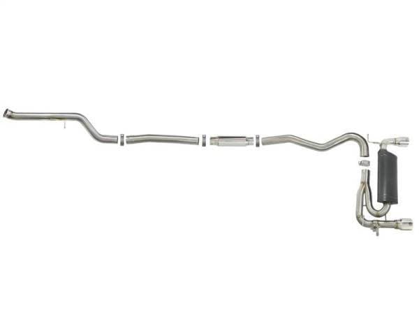 The aFe MACH Force-Xp cat-back exhaust system exceeds your quality and performance expectations. Mandrel bent 304 stainless steel tubing and high flow transverse muffler offers maximum exhaust flow and incorporates a factory style exhaust valve to control the exhaust note. The valve utilizes the factory valve motor and factory performance modes. When closed, it directs the exhaust through the high flow muffler for a smooth, tuned exhaust note. When opened, the exhaust is allowed to bypass the muffler and unleash sound and performance. Large diameter stainless steel exhaust tips come with a laser-etched aFe POWER logo for a stylish finish.
