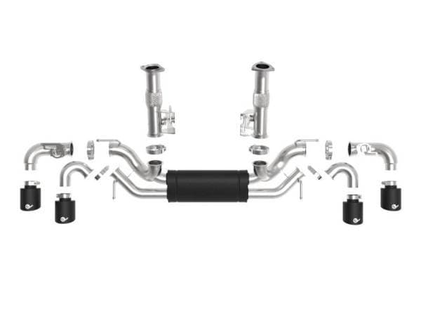 This system produced gains of up to +9 HP and +10 lbs. x Ft. TQ., as measured on our in-house dyno. This cat-back exhaust system is constructed of 3" - 2-1/2" mandrel-bent brushed finished 304 stainless steel tubing for maximum strength and durability. This system features a high-flow high-temperature metallic black muffler, producing a powerful sound. The muffler has a high-temperature metallic black finish for ultimate corrosion resistance. Finishing off this exhaust system are quad 4-1/2" diameter black stainless steel clamp-on exhaust tips. The tips feature a laser etched aFe POWER logo for a unique style. This system produces a powerful sound unleashing all available horsepower and torque. Utilizing factory style flanges and hangers this system is a direct bolt-on system, which requires no cutting or modifications for a hassle-free installation. This cat-back exhaust system uses a heavy duty flex pipe with an internal interlock liner for added strength and durability. The aFe Muffler features an integrated x-pipe to balance and evenly distribute exhaust pulses traveling through the exhaust system, minimizing exhaust drone and maximizing scavenging. This axle-back exhaust system incorporates factory style NPP dual mode & AFM (active fuel management) exhaust valves which use the factory exhaust valve motors (not included). The valves helps regulate, direct and control the flow of exhaust gases by opening, closing, or partially obstructing passageways depending on throttle position for maximum performance. Utilizing state-of-the-art computer-aided design technology, this exhaust system is designed for custom, high tolerance factory fitment. 100% TIG-Welded for race-proven strength and durability.