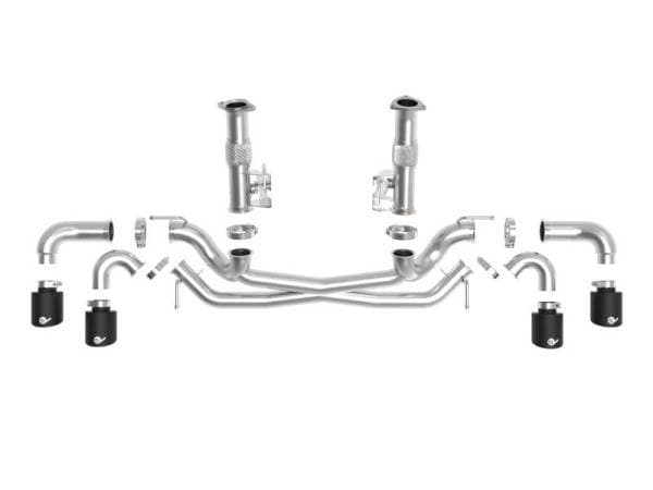 This cat-back exhaust system is constructed of 3" - 2-1/2" mandrel-bent brushed finished 304 stainless steel tubing for maximum strength and durability. Finishing off this exhaust system are quad 4-1/2" diameter black stainless steel clamp-on exhaust tips. The tips feature a laser etched aFe POWER logo for a unique style. This system produces an aggressive sound unleashing all available horsepower and torque. Utilizing factory style flanges and hangers this system is a direct bolt-on system, which requires no cutting or modifications for a hassle-free installation. This cat-back exhaust system uses a heavy duty flex pipe with an internal interlock liner for added strength and durability. A mitered merge x-pipe is used to balance and evenly distribute exhaust pulses traveling through the exhaust system, minimizing exhaust drone and maximizing scavenging. This axle-back exhaust system incorporates factory style AFM (active fuel management) exhaust valves which use the factory exhaust valve motors (not included). The AFM valves helps to control exhaust pulses during cylinder deactivation. Utilizing state-of-the-art computer-aided design technology, this exhaust system is designed for custom, high tolerance factory fitment. 100% TIG-Welded for race-proven strength and durability.