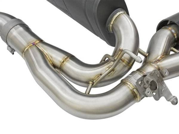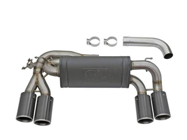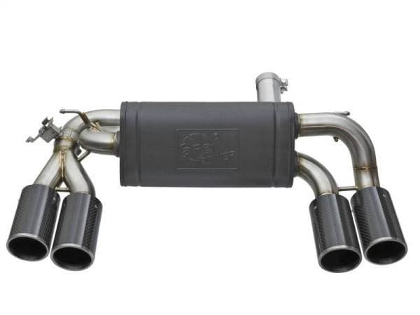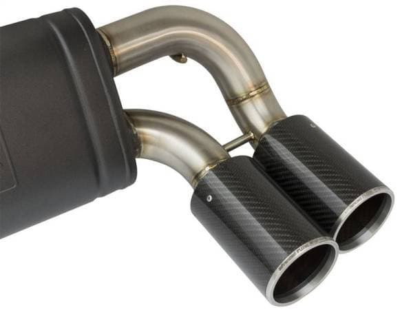 Aggressive Sound: A free-flowing, transverse muffler is used to absorb high pitch tones producing a powerful sound and unleashing all available horsepower and torque. The muffler is finished with a high-temp powder-coated black finish and a stamped aFe power logo. Exhaust Valve: This down-pipe back exhaust system incorporates a factory style exhaust valve which uses the factory exhaust valve motor (not included). The valve helps regulate, direct and control the flow of exhaust gases by opening, closing, or partially obstructing passageways depending on throttle position for maximum performance. Simple Installation: This MACH Force-Xp axle-back exhaust system uses factory mounting locations providing stability and a hassle-free installation. Quad 4" Carbon Fiber Tips: Finishing off this system are quad light weight, 4" diameter, pure carbon fiber tips. The tips come with CNC-Machined laser-etched inserts, which give an aggressive yet elegant sporty look. Leak-Free Seal: High quality band clamps are used for a complete 360 degree sealing surface. Brushed 304 SS Construction: The performance axle-back exhaust system is constructed of 3" to 2-1/2" mandrel-bent, brushed 304 stainless steel tubing for maximum performance, corrosion resistance and strength eliminating cracking. All aFe exhaust systems are engineered and manufactured in our Corona, California manufacturing facility.