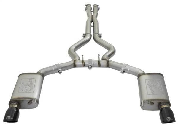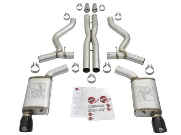 aFe is proud to introduce an all new Mach Force-Xp cat-back exhaust system. In testing, this system resulted in gains up to +11 horsepower and +14 lbs. x ft. of torque verified by our in house dyno. This cat-back exhaust system utilizes full 3" tubing with reduction tubes to fit the OE connections. Remove them and combine with the aFe power Twisted Steel Long tube headers and connection pipes (P/N: 48-33012-YC) for added flow and performance. This system incorporates dual, high-flow mufflers to improve performance across the power band while maintaining an aggressive sound. aFe also added an X-pipe to balance and evenly distribute exhaust pulses traveling through the exhaust system, creating more efficient flow and better performance while minimizing exhaust drone resulting in an awesome sound. To finish off the exhaust, dual 4" high-luster polished 304 stainless steel tips are included. This is a direct bolt-on system no modifications necessary and includes all necessary hardware for a hassle-free installation. Aggressive Sound: Dual free-flowing mufflers are used to absorb high pitch tones producing a powerful sound and unleashing all available horsepower and torque. X-Pipe Balance Tube: The equalizer balance tube evenly distributes exhaust pulses traveling through the exhaust system. This creates a more efficient flow for better performance while minimizing exhaust drone. Simple Installation: This is a direct bolt-on system which retains your factory exhaust tips and includes all necessary hardware for a hassle-free installation. No modifications necessary. Leak-Free Seal: High quality band clamps are used for a complete 360 degree sealing surface. Dual 304 SS Tips: Finishing off this unique exhaust system are dual, aFe laser etched, 4" gloss black 304 stainless steel tips for an aggressive style. Removable Reduction Pipes: They can be removed to combine with the aFe Twisted Steel long tube headers for increased flow and performance (P/N: 48-33012-YC).