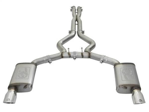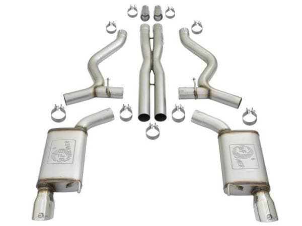 aFe is proud to introduce an all new Mach Force-Xp cat-back exhaust system for the 2015-2017 Ford Mustang with the V6-3.7L and V8-5.0L engine. In testing, this system resulted in gains up to +11 horsepower and +14 lbs. x ft. of torque verified by our in house dyno. This cat-back exhaust system utilizes full 3" tubing with reduction tubes to fit the OE connections. Remove them and combine with the aFe power Twisted Steel Long tube headers and connection pipes (P/N: 48-33012-YC ) for added flow and performance.This system incorporates dual, high-flow mufflers to improve performance across the power band while maintaining an aggressive sound. aFe also added an X-pipe to balance and evenly distribute exhaust pulses traveling through the exhaust system, creating more efficient flow and better performance while minimizing exhaust drone resulting in an awesome sound. To finish off the exhaust, dual 4" high-luster polished 304 stainless steel tips are included. This is a direct bolt-on system no modifications necessary and includes all necessary hardware for a hassle-free installation. Aggressive Sound: Dual free-flowing mufflers are used to absorb high pitch tones producing a powerful sound and unleashing all available horsepower and torque. X-Pipe Balance Tube: The equalizer balance tube evenly distributes exhaust pulses traveling through the exhaust system. This creates a more efficient flow for better performance while minimizing exhaust drone. Simple Installation: This is a direct bolt-on system which retains your factory exhaust tips and includes all necessary hardware for a hassle-free installation. No modifications necessary. Leak-Free Seal: High quality band clamps are used for a complete 360 degree sealing surface. Dual 304 SS Tips: Finishing off this unique exhaust system are dual, aFe laser etched, 4" polished 304 stainless steel tips for an aggressive style.