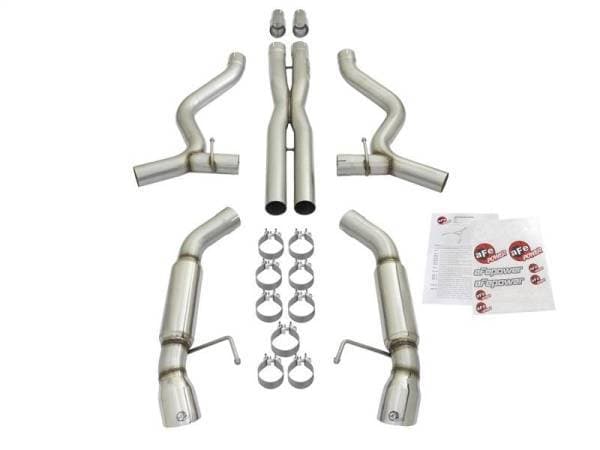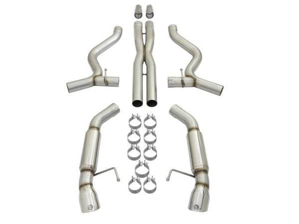 aFe is proud to introduce an all new MACH Force-Xp cat-back exhaust system for the 2015-2017 Ford Mustang with the V6-3.7L & V8-5.0L engine. In testing, this system resulted in gains up to +12 horsepower and +10 lbs. x Ft. of torque verified by our in house dyno. (*Dyno results are from P/N: 49-33087-B). This cat-back exhaust system utilizes full 3" tubing with reduction tubes to fit the OE connections. Remove them and combine with the aFe power Twisted Steel Long tube headers and connection pipes (48-33012-YC) for added flow and performance. This system incorporates dual, high-flow 4" round mufflers to improve performance across the power band while maintaining an aggressive sound. aFe also added an X-pipe to balance and evenly distribute exhaust pulses traveling through the exhaust system, creating more efficient flow and better performance while minimizing exhaust drone resulting in an awesome sound. To finish off the exhaust, dual 4" high-luster polished 304 stainless steel tips are included. This is a direct bolt-on system no modifications necessary and includes necessary hardware for a hassle-free installation. Aggressive Sound: Dual free-flowing 4" round mufflers are used to absorb high pitch tones producing a powerful sound and unleashing all available horsepower and torque. X-Pipe Balance Tube: The equalizer balance tube evenly distributes exhaust pulses traveling through the exhaust system. This creates a more efficient flow for better performance while minimizing exhaust drone. Simple Installation: This is a direct bolt-on system which retains your factory exhaust tips and includes necessary hardware for a hassle-free installation. No modifications necessary. Leak-Free Seal: High quality band clamps are used for a complete 360 degree sealing surface. Dual 304 SS Tips: Finishing off this unique exhaust system are dual, aFe laser etched, 4" polished 304 stainless steel tips for an aggressive style.