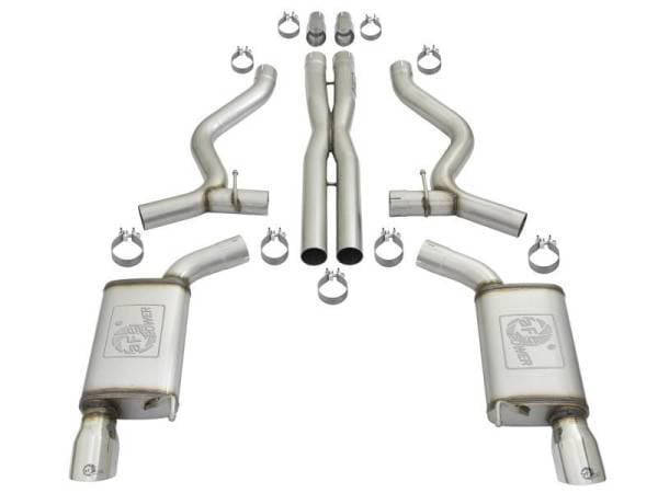 aFe is proud to introduce an all new MACH Force-Xp cat-back exhaust system for the 2015-2017 Ford Mustang with the V6-3.7L & V8-5.0L engine. In testing, this system resulted in gains up to +12 horsepower and +10 lbs. x Ft. of torque verified by our in house dyno. This cat-back exhaust system utilizes full 3" tubing with reduction tubes to fit the OE connections. Remove them and combine with the aFe power Twisted Steel Long tube headers and connect ion pipes (48-33012-YC) for added flow and performance. This system incorporates dual, high-flow mufflers to improve performance across the power band while maintaining an aggressive sound. aFe also added an X-pipe with resonators to balance and evenly distribute exhaust pulses traveling through the exhaust system, creating more efficient flow and better performance while minimizing exhaust drone resulting in an awesome sound. To finish off the exhaust, dual 4" high-luster polished 304 stainless steel tips are included. This is a direct bolt-on system no modifications necessary and includes necessary hardware for a hassle-free installation. Aggressive Sound: Dual free-flowing mufflers are used to absorb high pitch tones producing a powerful sound and unleashing all available horsepower and torque. X-Pipe with Resonators Balance Tube: The equalizer balance tube evenly distributes exhaust pulses traveling through the exhaust system. This creates a more efficient flow for better performance while minimizing exhaust drone. Simple Installation: This is a direct bolt-on system which retains your factory exhaust tips and includes necessary hardware for a hassle-free installation. No modifications necessary. Leak-Free Seal: High quality band clamps are used for a complete 360 degree sealing surface. Dual 304 SS Tips: Finishing off this unique exhaust system are dual, aFe laser etched, 4" polished 304 stainless steel tips for an aggressive style.