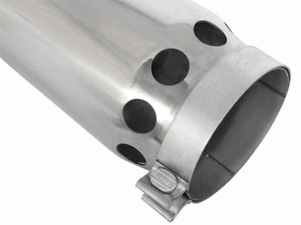 aFe Power is proud to introduce an all new intercooled exhaust tip. This tip comes with a polished finish and is designed to fit 5 exhaust systems. With a 5 inlet x 6 outlet and 16 inch length, this single-walled, angle cut rolled tip comes with intercooling vents and a unique laser-cut aFe Power logo plate riveted on for an aggressive style.