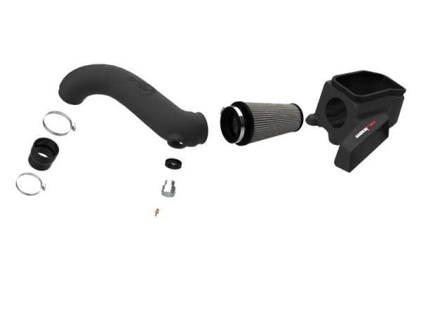 This 360-degree radial flow air filter features a 3.5" flange and our oil-free Pro DRY S media with three layers of synthetic media for maximum convenience. Its progressive layering provides great filtration efficiency and dust holding capacity, while not requiring the use of oils. This media is best suited for street use. Its inverted top makes for more filter surface area, resulting in longer service intervals. This system features a high quality, computer-designed, dyno-tuned intake tube to achieve maximum power gains while maintaining a perfect fit. Its XLPE material is heat soak resistant and extremely durable. It features an aFe Power design inspired by European vehicles. The included massive air filter is surrounded by an open-element XLPE (cross-linked polyethylene) polymer housing that minimizes warm engine air for maximum performance. Its open design allows for easy viewing of the air filter and delivers an aggressive Air Intake sound. It’s design incorporates the OEM air scoop to ensure that it gets the coldest air available. This is a direct fit intake system that utilizes factory mounting points and requires no cutting or modifications. All necessary clamps, couplings, and hardware are included. Its revolutionary design, featuring our unique filter-to-housing interface, uses half the number of parts of a traditional cold air intake system. Included billet aluminum fittings allows stock connections to transfer over seamlessly.