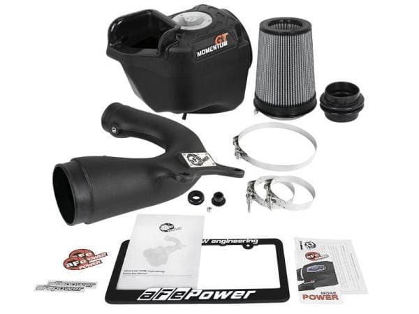 A custom CAD designed roto-molded housing made from heat soak resistant material eliminates the use of multiple components and ensures the coolest air intake charge available. A large clear sight window allows for filter inspection without removal of the airbox. The roto-molded housing is made out of black cross-linked polyethylene. (US PAT 9440175) For Filter-to-Housing Interface. This system uses a high quality plastic CAD designed, dyno-tuned, roto-molded intake tube to achieve maximum power gains while maintaining a perfect fit. This Momentum GT intake system was designed around the largest filter possible to allow maximum performance and filtration. This cone filter has a large 5" flange and is 9" tall with an inverted top. The Pro DRY S performance air filter features 3-layers of progressive finer porosity synthetic media providing maximum convenience with 100% polyurethane frame for long life and multiple cleaning cycles. Premium stainless steel clamps and a silicone coupling are used for strength and durability while also providing the most secure installation available. Momentum GT intakes are designed with fewer parts for a quick and simple installation.