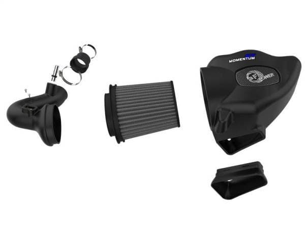 The smooth one-piece sealed housing is used to eliminate the use of multiple-piece housings and ensure the coolest air intake charge available. This System uses a CAD designed, dyno-tuned, roto-mold intake tube to achieve maximum power gains while maintaining a perfect fit. The Momentum ST intake is designed around an oil-free, large 9" Tall conical flat top 360 degree radial flow performance air filter with 3-layers of progressive finer porosity synthetic media providing maximum convenience. The unique air filter-to-housing interface (patent pending) allows for maximum filter size which increases the available air volume while simplifying the installation process. Premium stainless steel worm gear clamps and a silicone coupler are used for strength and durability while also providing the most secure installation available. Momentum ST intakes are designed with fewer parts for a quick and simple installation.
