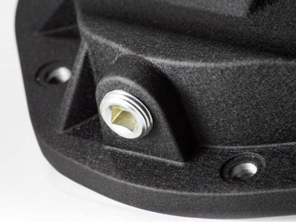 aFe Powers new front-end differential cover brings performance engineering to the protection of your trucks front-end. This differential cover has a 3-1/2 quart lube capacity (factory cover holds 2-1/2 quarts) at the factory fluid level line, a magnetic drain plug and a magnetic fill plug to remove unwanted debris. Built-in external fins transfer heat from the fluid to the outside air for maximum cooling. aFe has also designed a large oil level sight glass with calibration plug set to the factory fluid level to eliminate overfilling. Thi s differential cover is constructed out of durable die-cast A380 aluminum with reinforced ribs and a wrinkle black powder-coating for maximum strength and style. When it comes to engineering for power, performance, protection and value, aFe Power is the only choice.