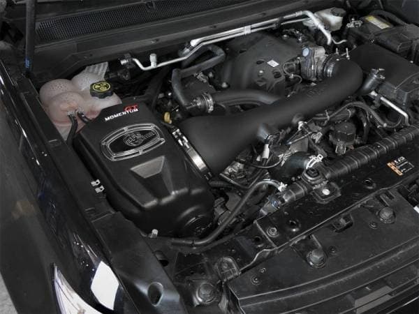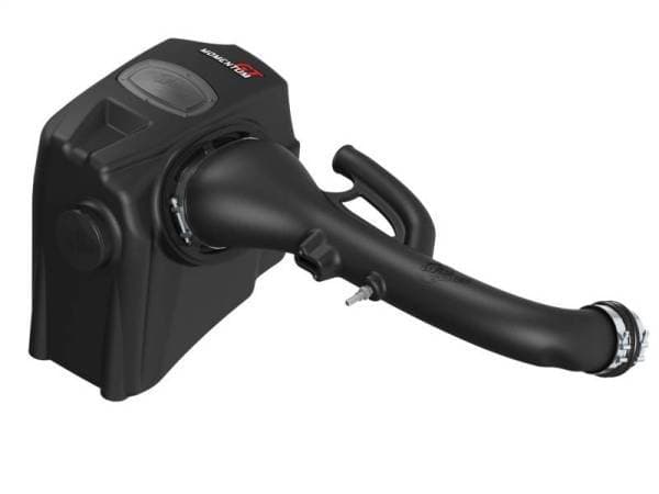 This Momentum GT intake system was designed around the largest filter possible to allow maximum performance and filtration. This cone filter has a large (6-3/4" x 4-3/4") oval flange and is 9" tall with an inverted top. The Pro 5R performance air filter features 5-layers of progressively finer mesh cotton gauze oiled media and is constructed with 100% polyurethane frame for long life and multiple cleaning cycles. A custom CAD designed roto-molded housing made from heat soak resistant material eliminates the use of multiple components and ensures the coolest air intake charge available. A large clear sight window allows for filter inspection without removal of the air box. The roto-molded housing is made out of black cross-linked polyethylene. A urethane plug is also included if you wish to block off the auxiliary air inlet. This system uses a high quality plastic CAD designed, dyno-tuned, roto-molded intake tube to achieve maximum power gains whi le maintaining a perfect fit.