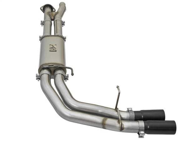This Rebel Series cat-back is designed with dual black exhaust tips that exit in front of the rear passenger tire for a unique, aggressive look. The tips come with unique laser-etched aFe Power logos on the side and are constructed from stainless steel for durability. The exhaust system is constructed from 3" MIG-welded, mandrel bent stainless steel tubing for maximum flow, increased horsepower and torque. The performance cat-back exhaust system includes necessary hardware and clamps for a hassle-free install, with no cutting required making it a true bolt on system. 3-1/2" Dia. Black Middle-Side Exit Tips: Finishing off the exhaust are dual 3-1/2" diameter black 304 stainless steel clamp-on tips with a laser-etched aFe power logo on the side for an aggressive style. The tips are designed to exit from in front of the rear passenger side tire for a unique custom look. Installation Is A Snap: This Rebel Series exhaust system uses factory mounting locations providing stability and hassle-free installation. Leak-Free Seal: High quality band clamps are used for a complete 360-degree sealing surface eliminating leak paths. Aggressive Sound: A free-flowing stainless steel muffler is used to absorb high pitch tones producing a powerful sound and unleashing all available horsepower and torque. Perfect Fit: OE-style bayonet hangers are used to maintain a stable pipe location during high vibration and high heat conditions. The bayonet tip holds the ha nger bushing in place for an OE-style fit that does not change with time. This makes for an easy installation with no cutting required.
