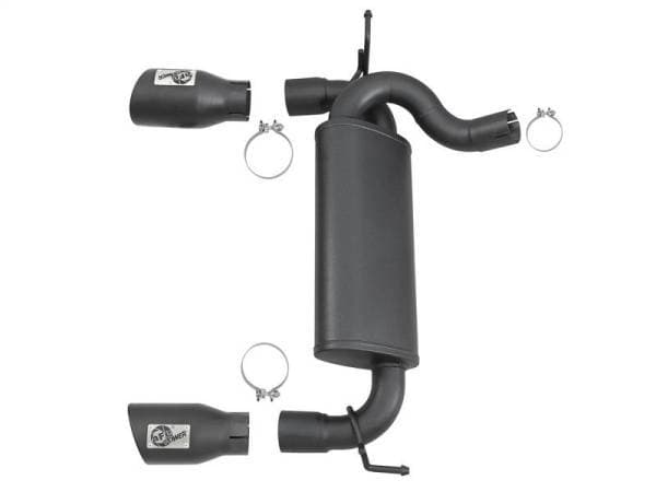 aFe's Rebel Series, dual black tip axle-back exhaust system for your 2007 - 2018 Jeep Wrangler (JK) with the V6-3.8L / 3.6L engine. This Rebel Series system is constructed with 2-1/2" mandrel bent 409 stainless steel tubing for improved exhaust flow. Utilizing factory mounting locations, the bayonet tip hangers ensure the Rebel Series exhaust has an OE-style fit and stays put under any driving conditions. A certified craftsman hand MIG welds the system for durability and longevity. High quality band clamps and hardware to provide a quick, hassle-free installation with no modifications necessary. Dual 4-1/2" angle-cut, high temp metallic black stainless steel exhaust tips with laser-cut aFe POWER badges to finish off the Rebel Series exhaust system for the perfect combination of performance, value and style. Aggressive Sound: A free-flowing, stainless steel, 18" length muffler is used to absorb high pitch tones producing a powerful sound and unleashing more horsepower and torque potential. Dual 4-1/2" Black Exhaust Tips: This dual rear-exit system features 4-1/2" dia. high temp metallic black, angle-cut, rolled, stainless steel exhaust tips w/ laser-cut aFe POWER badge for a custom-styled look. Installation is a snap: This Rebel Series exhaust system uses all factory mounting locations providing stability and a hassle-free installation. Perfect Fit: OE-style bayonet hangers are used to maintain a stable pipe location during any driving conditions. The bayonet tip holds the hanger bushing in place for an OE style, long lasting fit. Leak-Free Seal: High quality band clamps are used for a complete 360-degree sealing surface.
