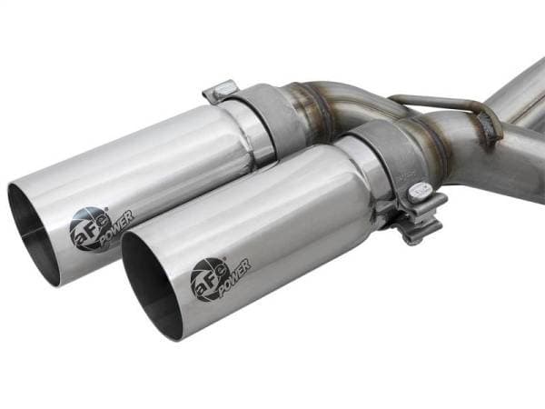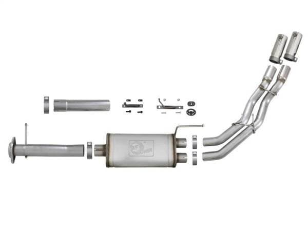 aFe POWER introduces an all new Rebel Series dual middle-side exit exhaust system for 2011-2014 Ford F150 EcoBoost with V6-3.5L (tt) engine. This Rebel Series cat-back is designed with dual polished exhaust tips that exit in front of the rear passenger tire for a unique, aggressive look. The tips come with a unique aFe Power logo laser etched on the side and constructed from stainless steel for durability. The exhaust system is constructed from 3" into dual 2-1/2" MIG-welded, mandrel bent stainless steel tubing for maximum flow, increased horsepower and torque. In testing, this cat-back exhaust system added an astounding +15 horsepower and +18 lbs. x ft. of torque as verified by our in house dyno. This kit uses an 18" free-flowing muffler to absorb high pitch tones producing a powerful sound, virtually eliminating drone. The performance cat-back exhaust system includes all necessary hardware and clamps for a hassle-free install, with no cutting required making it a true bolt on system.