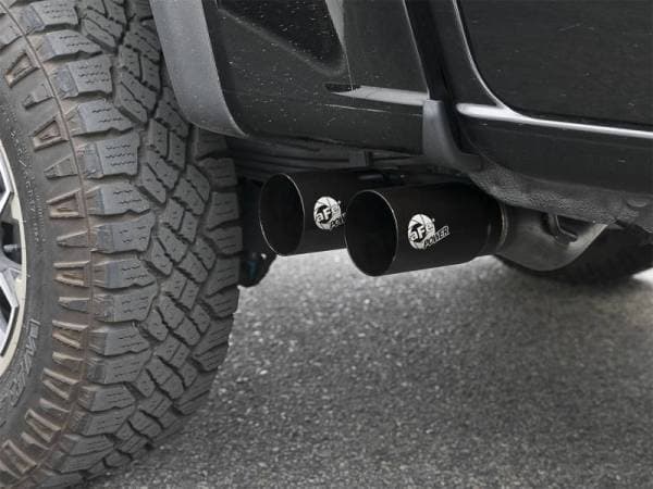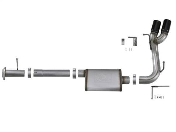 aFe power introduces the all new Rebel Series dual middle-side exit exhaust system. This Rebel Series cat-back is designed with dual black exhaust tips that exit in front of the rear passenger tire for a unique, aggressive look. The tips come with a unique aFe Power logos laser-etched on the side and constructed from stainless steel for durability. The exhaust system is constructed from 3" MIG-welded, mandrel bent stainless steel tubing for maximum flow, increased horsepower and torque. In testing, this cat-back exhaust system added an astounding +9 horsepower and +10 lbs. x ft. of torque as verified by our in house dyno. This kit uses an 18" free-flowing muffler to absorb high pitch tones producing a powerful sound, virtually eliminating drone. The performance cat-back exhaust system includes all necessary hardware and clamps for a hassle-free install, with no cutting required making it a true bolt on system.