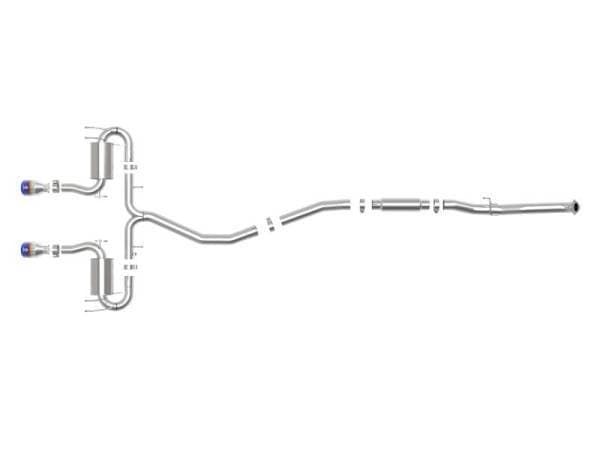 Performance Gains: This system produced gains of up to +6 HP and +5 lbs. x Ft. TQ., as measured on our in-house dyno.3" - 2-1/2" 304 Stainless Steel Construction: This cat-back exhaust system is constructed of 3" - 2-1/2" mandrel-bent, brushed finished 304 stainless steel tubing for maximum strength and durability.High-Flow 304 Stainless Steel Polished Mufflers: This system features high-flow 304 stainless steel polished mufflers, producing a smooth sound. The mufflers has a polished finish for ultimate corrosion resistance.Dual 4-1/2" Diameter Blue Flame Exhaust Tips: Finishing off this exhaust system are dual 4-1/2" diameter blue flame 304 stainless steel clamp-on exhaust tips. The tips features a laser etched Takeda logo for a unique style.Installation: Utilizing a factory style flange and hangers this system is a direct bolt-on system, which requires no cutting or modifications for a hassle-free installation.Integrated Mitered Merge Collector: A mitered merge collector is used to decrease turbulence and increase exhaust velocity resulting in increased horsepower, torque and improved throttle response.Computer-Aided Design: Utilizing state-of-the-art computer-aided design technology, this exhaust system is designed for custom, high tolerance factory fitment.TIG-Welded: 100% TIG-Welded for race-proven strength and durability.Emissions Disclaimer: This product does not require a CARB EO#.aFe POWER exhaust systems are engineered and manufactured in our Corona, California facility.
