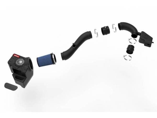 This aFe POWER Pro 5R is a 7-1/2†tall, pre-oiled, 360-degree radial flow performance air filter with five layers of progressively finer cotton gauze media for maximum performance. It provides your engine with the largest amount of high-flowing air, usually resulting in the highest power gains out of all our filter media options. This media is perfect for street and/or track use. Its inverted top makes for more filter surface area, resulting in more flow and longer service intervals. This system features a two-piece, computer-designed, roto-molded intake tube to achieve maximum power gains while maintaining a perfect fit. Constructed from XLPE polymer (cross-linked polyethylene), it is heat soak resistant and extremely durable. A factory-style Helmholtz Chamber is integrated into its design, toning down any drone. The sealed XLPE polymer housing features a rugged design, inspired by off-road tires, as well as a clear sight window, allowing for hassle-free filter inspection. aFe POWER's patent pending filter-to-housing interface eliminates the use of an overabundance of parts, further simplifying the installation process. Additional cool air is brought into the housing via the factory air inlet scoop. All stainless-steel clamps, hardware, and injection molded and silicone couplings are included for a hassle-free installation. This is a direct bolt-on kit that requires no cutting or drilling on OEM parts.