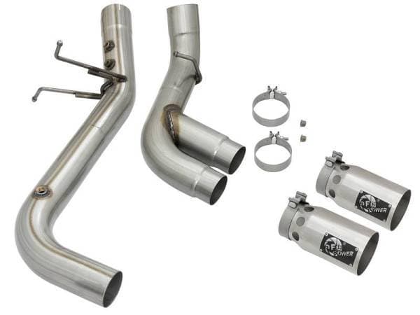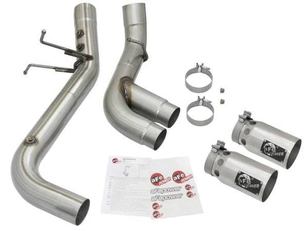 Simple Installation: All systems use factory mounting locations providing stability and hassle-free installation. Leak-Free Seal: High quality band clamps are included for a complete 360 degree sealing surface. OE Fit: OE-style bayonet hangers are used to maintain a stable pipe location during high vibration and high heat conditions. The bayonet tip holds the hanger bushing in place for an OE-style fit that does not change with time. Flow and Performance This exhaust system is constructed of 4" mandrel-bent stainless steel tubing for maximum flow. Smooth transition bends allow for low turbulence, increasing horsepower, torque and lowering EGT's. 5" Diameter Polished Intercooled Tips: Finishing off the exhaust are 5" diameter, polished, stainless steel straight cut tips with intercooling vents designed to reduce exhaust gas temperatures at the tailpipe. A unique stainless steel laser-cut aFe Power logo plate is riveted on for an aggressive style. **Cutting stock exhaust is required.