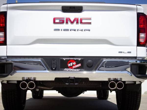 Now your 19-20 Silverado/Sierra can have that dual exhaust look with this aFe POWER Vulcan Series cat-back exhaust system. 3" to dual 2-1/2" mandrel-bent, 304 stainless steel tubing and high-flow muffler improves performance across the power band and delivers a deep, aggressive exhaust tone. 100% MIG-welded for strength and durability with quad 3-1/2" polished 304 stainless steel exhaust tips for an aggressive custom look.3" to Dual 2-1/2" 304 Stainless Steel Tubing: This system is constructed of durable mandrel-bent 3" to dual 2-1/2" 304 stainless steel tubing for maximum corrosion resistance. Mandrel-bent tubing for maximum air flow and low turbulence increasing torque, horsepower and improved throttle response.High-Flow Performance Muffler: A single-in, dual-out high-flow stainless steel muffler allows increased exhaust flow and reduces exhaust drone, maintaining a deep, tuned sound.Quad Polished Tips: Dual exhaust with quad 3-1/2" polished 304 stainless steel exhaust tips for an aggressive, unique appearance.Perfect Fit: Factory-style bayonet hangers are used to maintain a stable pipe location during high vibration and high heat conditions for a secure fit.Hassle-Free Installation: Quality hardware and clamps are included for a hassle-free installation.It may be necessary to cut the OE Exhaust to remove it from the vehicle.This item fits: Crew Cab / Short Bed (69.92"), Crew Cab / Standard Bed (79.44"), Double Cab / Standard Bed (79.44")Emissions Disclaimer: This product does not require a CARB EO#All aFe POWER exhaust systems are engineered and manufactured in our Corona, California manufacturing facility.