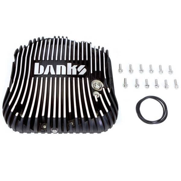 Fuel Economy was tested on the Mustang dyno using the OBD-II fuel flow rate and vehicle speed data, as well as the Banks emissions analyzer to measure fuel economy calculated from tailpipe emissions. The dyno was calibrated to simulate a 7,500 lb vehicle with an engine output of 30 HP required to maintain a 50 mph steady state speed. The truck was warmed to operating temperature then held at a constant 50 mph for a fixed length of time to procure an accurate average fuel consumption. The test was repeated for all covers as per their respective manufacturer’s fill level specifications.Features and BenefitsBanks cools 5X better than flat-back covers in on-road towing tests over the same road, same weather, operator and vehicleBanks cools 118% better than flat-back covers in controlled 200hp 60mph sustained dyno testsNew patented design features Ram-Air scoopsForces air up and into massive heat radiation fins providing the fastest cooling on the marketProvides cold high velocity air, overcoming “dead air zone†behind differentialEngineered to break-away if snagged on an obstacleInternal heat absorption fins transfer heat through the cover to the external finsDry-mount high-pressure silicone O-ring seal. No messy RTV clean up when servicing differentialClears spare tire heat shield, Panhard bars and other suspension componentsLowest point is the rear differential housing, not the Banks Ram-Air coverLimited Lifetime WarrantyFluid DynamicsCover mates perfectly with differential housing for unobstructed fluid flowRing gear raceway controls the fluid flow path to the pinion and bearing setsAxle tube lubricant guides direct fluid to axle bearings without over-fillingLow fluid aeration means longer fluid life