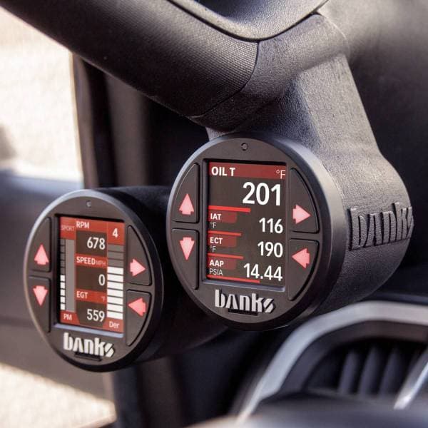 Banks iDash is the smallest, most powerful plug-n-play OBD-II monitor and control interface on the market. With its easy to read 2- to 8-gauge user selectable LCD display, the iDash 1.8 reads a multitude of engine parameters and internal data directly the vehicle's ECU via OBD-II. It also opens a whole new world of Banks exclusive calculated parameters not available on any other device. Set custom low and high alerts for any engine parameter. Monitor max and min values for a user selectable list of parameters. Read and clear trouble codes on-the-fly. Customize the navigation button and LCD display colors, brightness, and even the rate at which they dim at night. Daisy chain 4 iDash gauges and view up to 32 parameters simultaneously. Add Banks sensor modules such as the 4-channel analog module, 4-channel thermocouple module, and AirMouse Ambient Air Density Module for nearly infinite vehicle and weather analysis. For those who want to record their vehicle's parameters, the iDash DataMonster adds data logging for up to 100 user selectable parameters at a rate of up to 20 samples per second. With the included microSD card, owners can log over a months' worth of continuous data. Data can be played back right on the iDash or transferred to a computer for deeper analysis. Expand functionality with Banks Modules (Pressure/Temp Sensors, and more).