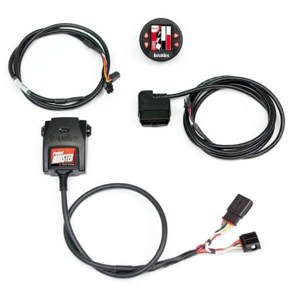"What Is It? PedalMonster is the first OBD-II connected throttle sensitivity controller for gas and diesel vehicles. Controlled via Banks iDash or mobile app, PedalMonster is the only module of its kind to offer safety features like ActiveSafety(R), Reverse Safety and Adjustable Low-Speed Trim. City, Sport, and Track modes, each with 10 sensitivity levels OBD-II connected ActiveSafety failsafe circuitry with Health Monitoring Reverse safety returns pedal to stock in reverse gear Adjustable Low-Speed Trim controls how fast sensitivity is added at slow speeds Powered by +12V via OBD, not low-overhead pedal circuit Controlled by iDash DataMonster, iDash SuperGauge, and mobile app PedalMonster stacks with any flash or inline tuner!!! Not just Banks View PedalMonster's activity in real-time via iDash and mobile app Simple plug-and-play installation Warranty friendly. Does not leave footprint after removal. Customizable gauge display Read Boost Pressure, EGT and so much more Avoid costly repairs by monitoring important sensors Display 2-8 values Read up to 80 OBDII Mode 01 values Over 300 parameters available View Data your dash does not display Displays accurate values your OEM dash gauges filter Includes patented OBDII Density (exclusive to Banks) Log up to 20 min/max values Built-in Shift & RPM Light Connect multiple iDash gauges Auto-Dimming Feature Fits standard 52mm (2-1/16 inch) gauge mounts Features vary by application US Patent #10,933,885