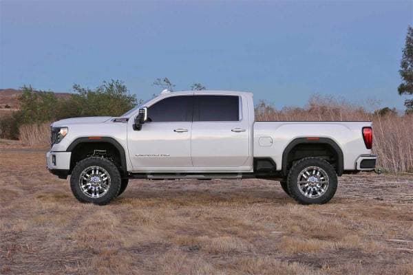 This high quality 6" lift kit for the GMC Sierra and Chevy Silverado 2500HD has been designed to improve the offroad capability of the vehicle while providing a smooth highway ride. The Fabtech lift kit retains the factory load carrying capacity of the vehicle that is perfect for owners that use their truck for towing and hauling. The heart of this lift kit is Fabtechs cutting edge RTS design. The RTS is a bracket system that keeps the torsion bars in the factory location while providing lift. This feature provides superior ground clearance at the frame as there are no torsion bars hanging down to become high centered on or damaged when offroading. It provides a very clean appearance to the vehicle. Another important aspect of this GM 2500HD lift kit is the lower control arm crossmembers. They are arched at the bottom to provide ground clearance and have a skid plate to protect the front differential against offroad obstacles. The crossmembers and bracketry are built with 1/4" thick steel that provides strength and rigidity to the vehicles suspension. The superior build quality and design of the components allows for a fast installation time with only four holes to drill and no cutting of the front diff housing. This heavy duty GMC Sierra and Chevy Silverado 2500HD lift kit is built with the highest quality components and is designed to provide years of trouble free service while offering a great ride. FEATURES: Torsion bars remain in the factory frame location for maximum ground clearance. RTS Torsion bar brackets index the bars at factory setting for a smooth ride. Heavy duty bracketry constructed of 1/4" thick steel for additional suspension strength. Near factory track width helps keep tires under the fenders. Front & Rear bump stop brackets eliminate over cycling of suspension. CROSSMEMBERS: 1/4" thick steel lower control arm Crossmembers are arched for maximum ground clearance. The welded box design of these Crossmembers provides additional st