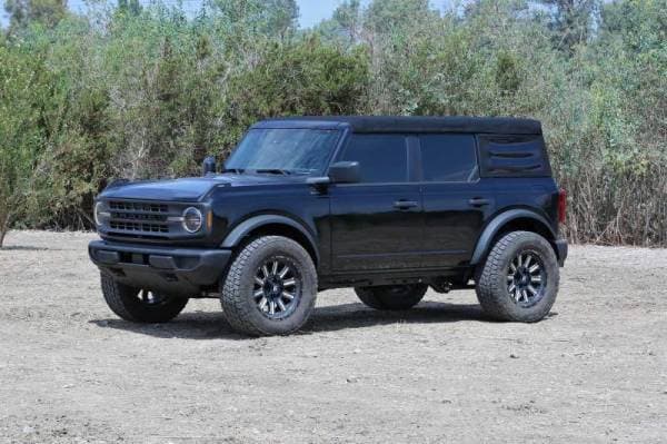Fabtech?s 2021 Ford Bronco 4WD Leveling Kit features CNC machined aluminum front billet spacers that work in conjunction with the factory Coilover shock assemblies. They are designed to bolt in without the disassembly of the factory coilover shocks for a fast installation. Fabtech engineers have established that the design of these billet spacers are at the maximum height without creating ball joint or tie rod bind when the suspension is cycling throughout the entire range of travel. The Fabtech spacers are installed on top of the coilover. This lift method retains the Bronco?s compliant smooth ride with additional front lift to help level and provide clearance for oversized tires. Fabtech offers an exclusive Trade Up program on all their Leveling Kits. If you ever want to step up to a complete Fabtech Lift Kit after you buy a Leveling Kit, you can trade in the previously purchased kit towards the price of a new Fabtech system. Please see program details. FEATURES: High grade hardware, Aircraft grade billet aluminum, Properly engineered to eliminate ball joint, tie rod and steering bind. 5 Year 60,000 Mile Powertrain Warranty.