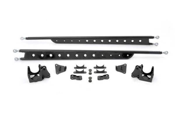 Our Traction Bars are designed to reduce rear leaf spring axle wrap caused by lift blocks and oversized tires. Typically the travel cycle of the Super Duty rear axle is an arch. Fabtech's exclusive traction bar shackle system allows the bars to float with the arched travel of the rear axle. This provides a non-binding, smooth highway ride, while still providing positive resistance to torque loads, reducing axle wrap and increasing tire traction.