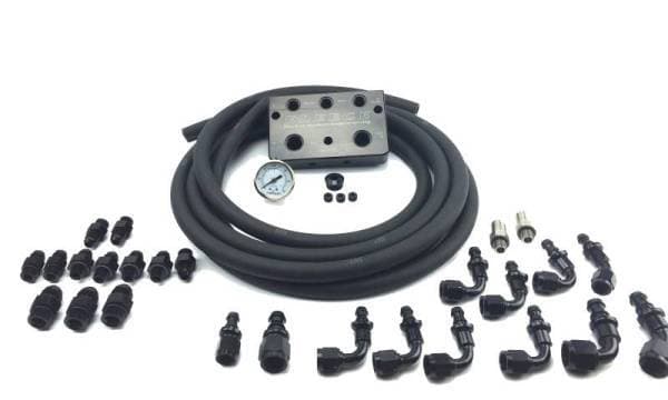 The Fleece Performance Cummins Regulated Return Fuel Distribution block takes our standard fuel distribution block to the next level by fully integrating a high flow pressure regulator. This feature in combination with high flow aftermarket electric fuel pumps without built in pressure regulation provides more consistent fuel pressure at the CP3. It also has one additional return line port, and one additional feed line port. The additional return line port allows you to remove the factory fuel pressure relief valve hard line and fuel injector return galley hard line to provide clearance for high flow side draft intakes, common on competition engines. The two feed line ports allow you to run two lift pumps to ensure you always have enough fuel volume. Metric straight thread to AN fittings and hose are included to replace the aforementioned hard lines and plumb those returns to the regulated return distribution block (NOTE this kit does not include 1/2? (-8AN) or 3/8? (-6AN) fuel line to feed the distribution block or return to the tank). There is also a 0-60 psi pressure gauge included to allow for quick visual checks of fuel pressure set-point.