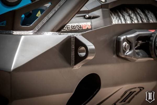 Tackle the toughest trails with the PRO Series Recessed Winch Bumper from ICON! Designed for the ultimate in off-road form and function, PRO Series features a multi-faceted, high-clearance design that sneaks past the tightest rocks. The "stubby" width protects the Jeep's lower grille corners while allowing the front tires maximum room for articulation and access to grip and pull the vehicle over steep obstacles. The integrated, recessed winch mount places the winch low, achieving a lower center of gravity as well as increased airflow through the radiator. The winch fairlead mount is integrated right into the front surface of the bumper. If you do manage to get yourself into a tight spot, recovery is aided by a pair of extreme duty recovery shackle tabs, CNC machined from beefy 1" thick plate steel. And like the rest of the PRO Series bumper, even the recovery tabs are angled for maximum clearance. Recessed light mounts protect either the Jeep's stock fog lamps or your favorite aftermarket LED lights. The bumper is fabricated from CNC laser cut, precision brake-formed 3/16 plate steel and the Impact Bar is made of 1-3/4" DOM tubing, with plate steel gussets. The bumper looks as great as it performs, with a durable, semi-gloss black powder coat finish.