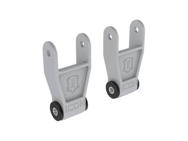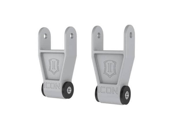 Fine tune the rear ride height on your 2010-2023 Ford F-150 or Ford Super Duty with ICON Vehicle Dynamics’ Billet Aluminum Lowering Shackle Kit. CNC machined from 6061 aviation grade aluminum these billet shackles offer increased strength compared to the thin steel of the stock units to better withstand the stresses of aggressive off-road use. Their increased length also lowers the rear ride height of the truck by 1â€, requiring less front lift to achieve a level stance or to assist in rear ride height tuning with aftermarket leaf springs. Their gusseted design ensures proper bushing clearance to allow fitment for stock leaf springs, ICON F-150 Multi-Rate Leaf Springs, ICON Supoer Duty leaf springs, and most other aftermarket spring packs for a wide range of suspension setup options. Pre-installed, replaceable, press in OE Ford bonded bushings make for an easy install, require no periodic greasing, and offer noise free operation while still cycling full suspension travel. The shackles look as great as they perform with a satin gray anodized finish.