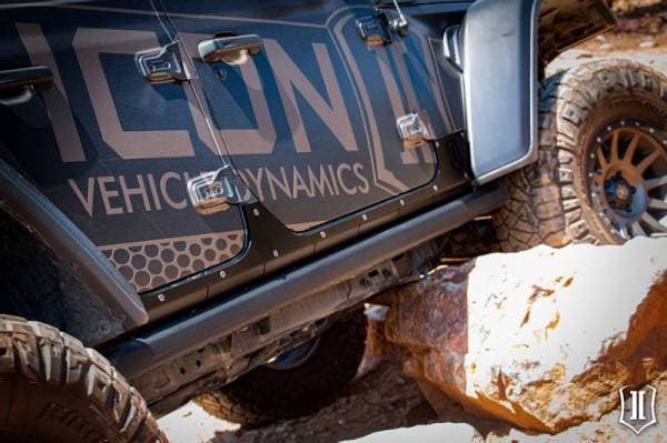 ICON Impact Body Armor for Jeep Wrangler JL 4-Door protects the vulnerable rocker panel area of the Jeep's body sheet metal from rocks, and trail hazards as well as gravel kicked up by the tires. It can also protect against boot scuffs on Jeeps equipped with entry step-style rocker rails. Impact Body Armor is manufactured from CNC laser cut 3/16" aluminum plate which has been precision brake-formed to fit the Jeep's body contours like a glove. This aluminum Body Armor is light weight, rugged and corrosion resistant. Body Armor can be installed by itself or in conjunction with OE Rubicon style rocker rails or frame-mounted rockers such as ICON Impact COMP Series Frame Mount Sliders. Stainless steel flat-head hardware is provided. Note that installation requires drilling and installing rivet nuts in the Jeep's body sheet metal. ICON Impact JL Body Armor is finished in great looking, a durable multi-stage semi-gloss black powder coat finish. Wheel with confidence knowing that ICON Impact products are covered by ICON's Limited Lifetime Warranty.