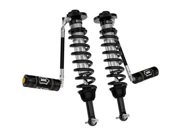ICON Vehicle Dynamics V.S. Series 2.5†coilover shocks are an incredible upgrade for the front end of 2021-2023 Ford F-150 4WD trucks. ICON’s Vehicle-specific valving provides a sport tuned feel on and off-road while 2.75-3.5†of lift height adjustability allows the use of larger, more aggressive wheel and tire combinations. The larger 2.5†shock body and increased piston area over stock components provides improved damping ability and outstanding ride characteristics across varying types of terrain. Remote reservoirs ensure optimum performance by increasing the duration of consistent damping regardless of situation, keeping the shocks at a cooler operating temperature during heavy use. When paired with ICON rear 2.0 Aluminum Series or 2.5 Series shocks vehicle control will be balanced front to rear, resulting in the best overall driving experience for your F-150 truck.