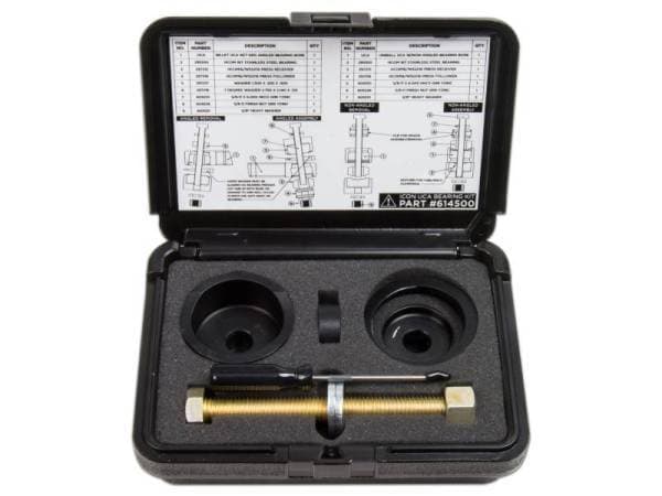 The ICON On-Vehicle Uniball Replacement Tool Kit comes complete with everything necessary to service uniballs in ICON upper control arms, as well as other control arms that utilize a 1" uniball. The design of this kit allows for the job to be performed with the control arm still on the vehicle, minimizing the work and time involved with this task. Because a hydraulic press is not required when using this kit, safety is improved while the chance of permanent damage to the control arm is reduced.
