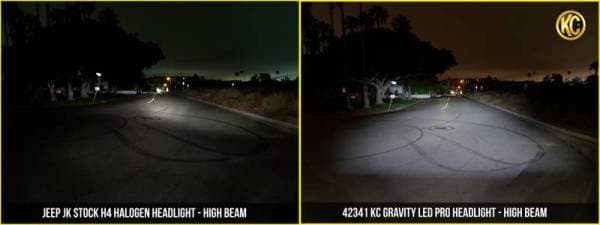 FEATURES-Gravity LED Pro 7" Headlights-Patented Gravity Projector Optics(GPO)-Hard Coated Polycarbonate Lens-Precision Die-Cast Aluminum Housing-DOT Compliant Low and High Beam with built-in Daytime Running Light-KC Engineered Polished Reflector Optics-Plug-n-Play for Jeep JK-***Note: Does not fit 17-18 Jeep JK Rubicon/Sahara editions or Jeeps equipped with factory LED headlightsLIGHT PERFORMANCE(PER LIGHT)-Raw Lumens: Low- 2,967 lm, High- 2,575 lm, DRL- 386 lm-Lux @ 10 Meters: Low- 400 lx, High- 700 lx?-Candela: Low- 40,000 cd, High- 70,000 cd-Beam Distance: Low- 400m, High- 529mSPECIFICATIONS(PER LIGHT)-Wattage: Low- 18W, High- 25W-LED Bulb: CREE: XPL/XPG2-Color Temp: 5000K-Amp Draw: 1.88A-Voltage: 9V-18V-IP Rating: IP68-Product Dimensions: W - 6.96" x D - 5.098"Gravity EXTREME OUTPUT AND EFFICIENCYThe Gravity LED Pro 7" headlight uses KC's patented Gravity Projector Optic (GPO). Utilizing this proprietary projector lens technology along with a GRD LED core, KC engineers were able to deliver a more controlled beam pattern while setting new industry standards in light shape, clarity and output. HIGH-PERFORMANCE REFLECTOR OPTICSThe Gravity LED Pro 7" Headlight features KC's patented Gravity GRD technology, which is engineered to direct every lumen from powerful LEDs into usable light output.HIGH/LOW/DRL FUNCTIONHigh/Low beams as well as DRL functionality come installed in this KC projector headlight to greatly improve visibility and clarity over factory Jeep headlights.DESIGNED FOR DURABILITYThe Gravity LED Pro 7" Headlight uses a durable die-cast housing and Polycarbonate lens, to tolerate the harshest climates and conditions.