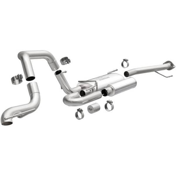 The MagnaFlow Toyota 4Runner Overland Series Cat-Back Performance Exhaust System #19546 will enhance your 4.0L V6 Toyota 4Runner (2003-2021) with MagnaFlow’s renowned deep rumble and dyno-proven performance. MagnaFlow #19546 i's weight optimized for additional utility and designed such that its mandrel bent 2.5†diameter main piping is situated more closely to the body than the stock configuration. This combined with a single high-clearance no-tip, passenger-side rear exhaust exit allows for significantly improved ground clearance and departure angles. MagnaFlow exhaust system #19546 is compatible with the most popular bolt-on aftermarket modifications and features our No Drone Technology, which cancels out the natural droning frequencies of the V6 Toyota 4Runner at cruising speeds. This allows for a quiet ride on the highway while retaining the character of your rig’s exhaust note. CNC precision robotic manufacturing enables perfect fitment and hassle-free bolt-on installation. The 100% stainless steel construction of exhaust kit #19546 is covered by MagnaFlow’s limited lifetime construction warranty.