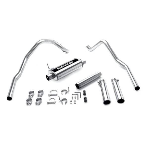 The MagnaFlow Dodge Dakota Street Series 15735 brings out the personality of your 3.9L, 5.2L, 5.9L 1997-1999 Dodge Dakota with our signature resonant, powerful engine tone and dyno-proven performance. Thanks to its fast-flowing, mandrel bent 3in. main piping and 1 Straight-Through mufflers ending in a Dual Split Rear exit with 3.5in. Polished Clamp-On-Single Wall-Angle Cut-Rolled Edge tips, this Dodge Dakota exhaust kit has the performance chops to match its sporty sound and appearance. Upgrade your ride to the next level with an exhaust that has the pipes to put other Dodge Dakota’s to shame. With this system your vehicle will be producing Agressive exterior and Moderate interior sound levels while leaving other cars and trucks feeling envious at every stoplight. Exhaust kit 15735 features a cat-back layout that replaces your ride’s stock exhaust components from near the catalytic converter on back. Extensive 3D scanning during development has resulted in a direct-fit design that you can easily install yourself. 15735 is produced using CNC precision robotic manufacturing techniques and is backed by MagnaFlow’s 1-year limited finish warranty and limited lifetime construction warranty.